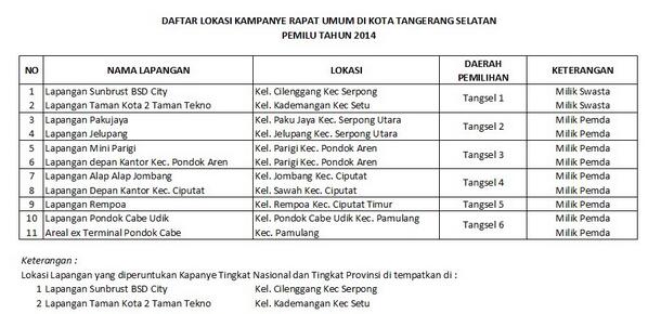 Daftar Lokasi Kampanye Pileg 2014 di Kota Tangerang Selatan :